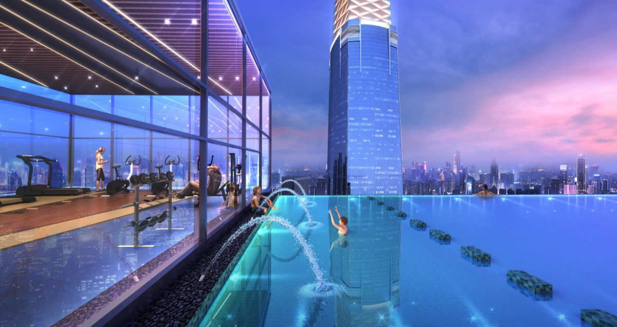 - A panoramic infinity pool and sky deck with breathtaking skyline views.